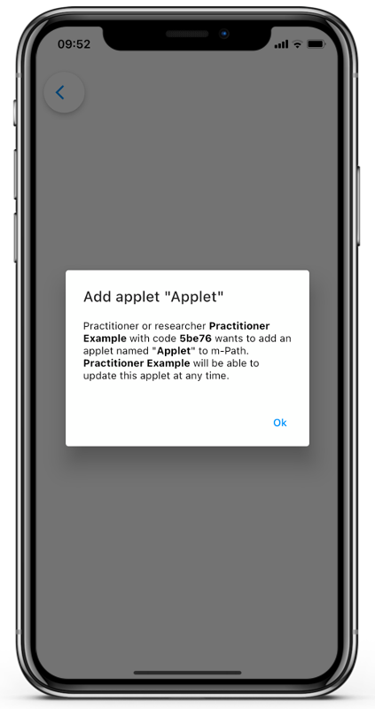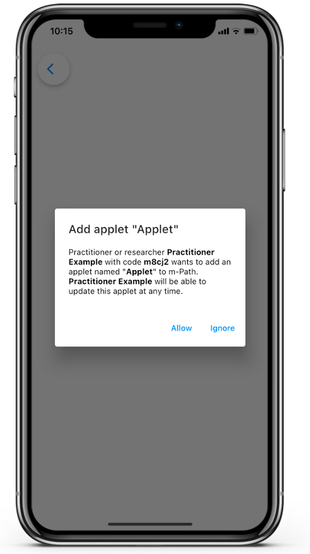 When this option is ticked, installation of this applet will also trigger “Applet Mode” on the client device. When the user starts up the app while this mode is active, m-Path will boot straight into the applet homepage, instead of the m-Path homescreen. This is useful for practitioners who only need clients to access actions in an intervention, and do not need other m-Path functionalities. It is still possible to use all m-Path features such as sending beeps, and after a beep has been completed, the user will be redirected to the applet homepage, so the applet becomes the nota bene application.