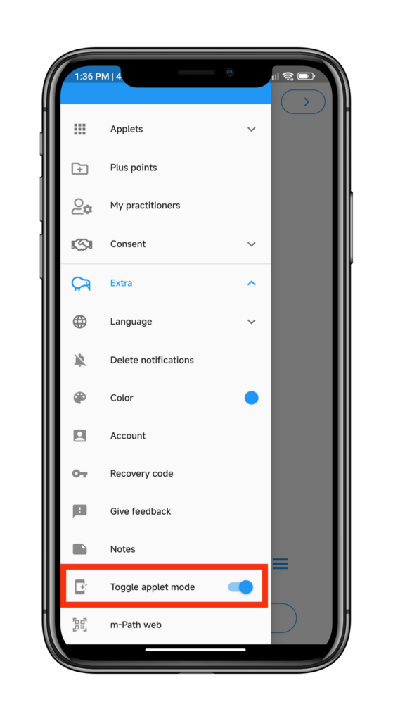 Clients can still return to the actual m-Path homepage by pressing the home icon on the first page of the applet. If they want to turn off the applet mode, a switch can be accessed under Settings -> Extra -> Toggle Applet Mode.