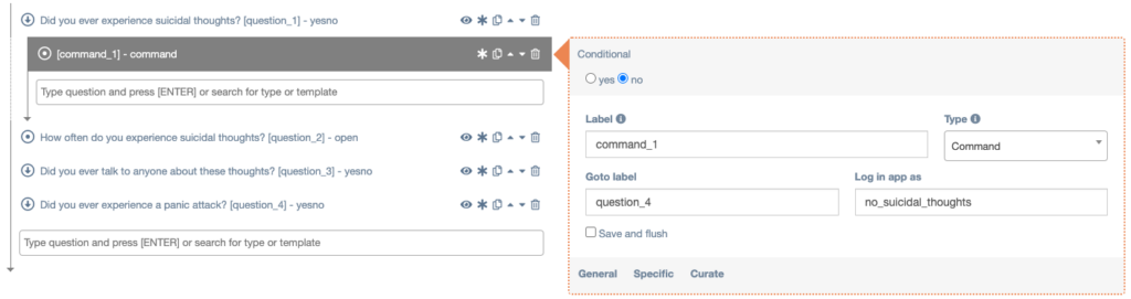 For example, a questionnaire might contain a Yes/No question on suicidal thoughts (i.e. ‘Did you ever experience suicidal thoughts?’). Assume this is the first question of this questionnaire (with label ‘question_1’).