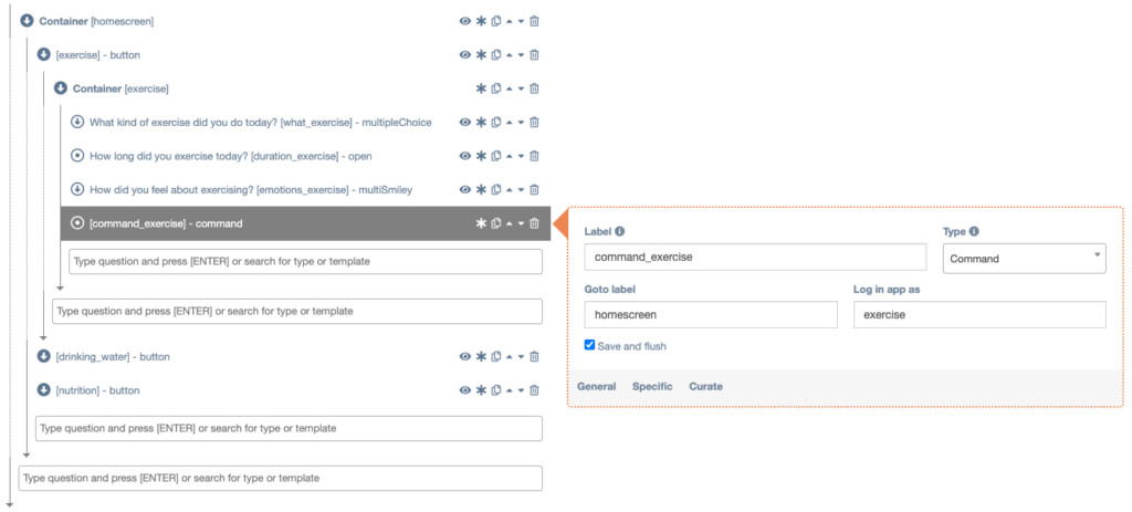 - Save and flush: If you check the Save and flush box, all answers up to the command item will be saved. This function is especially important when creating applets. This should be used as little as possible in normal questionnaires. Certainly not after each question!