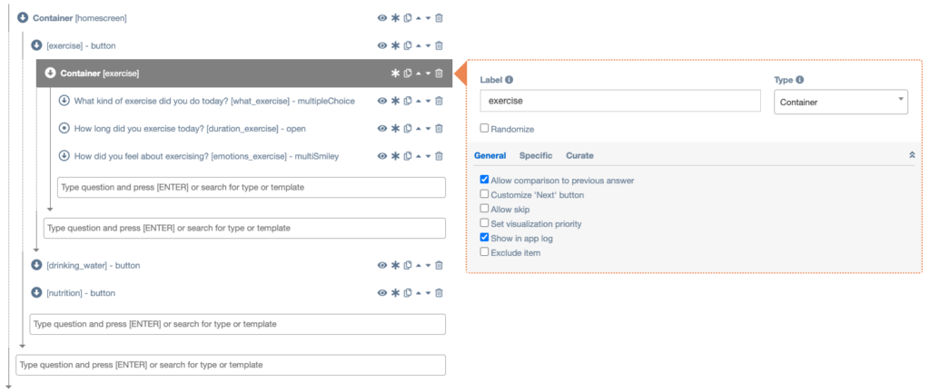 Under the ‘Exercise’ button, we will add a questionnaire with three questions. We put them in a container so that they are displayed as one questionnaire. This looks as follows: