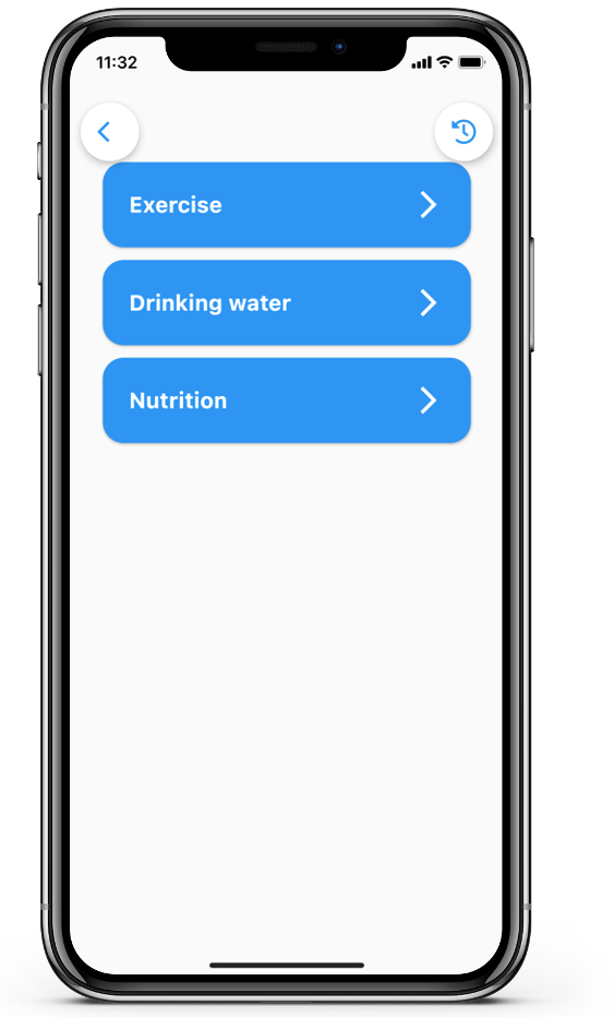 The applet in this example consists of a home screen that contains three buttons: ‘Exercise’, ‘Drinking water’ and ‘Nutrition’. We will only elaborate on one of these buttons, but the same method can be applied to the other ones. The home screen of the applet will look like this: