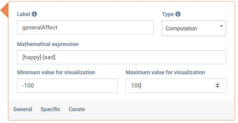 4. [optional] Fill in the minimum and maximum value for visualization. If this computation question needs to be visualized in a plot, m-Path needs to know its minimum and maximum values. As the minimum and maximum value of the ‘How happy are you now?’ question are 0 and 100, the minimum and maximum value of happyPlus50 are 50 and 150.