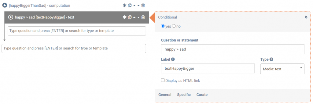 Conditions can be defined for computation questions. The interactions or questions in the yes condition will only be shown if the result of the computation question was equal to 1.