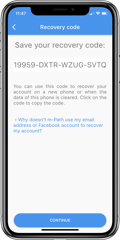 Your recovery code is a code that can be used to recover your account on a new device or after reinstalling the app.