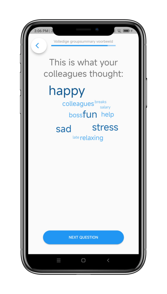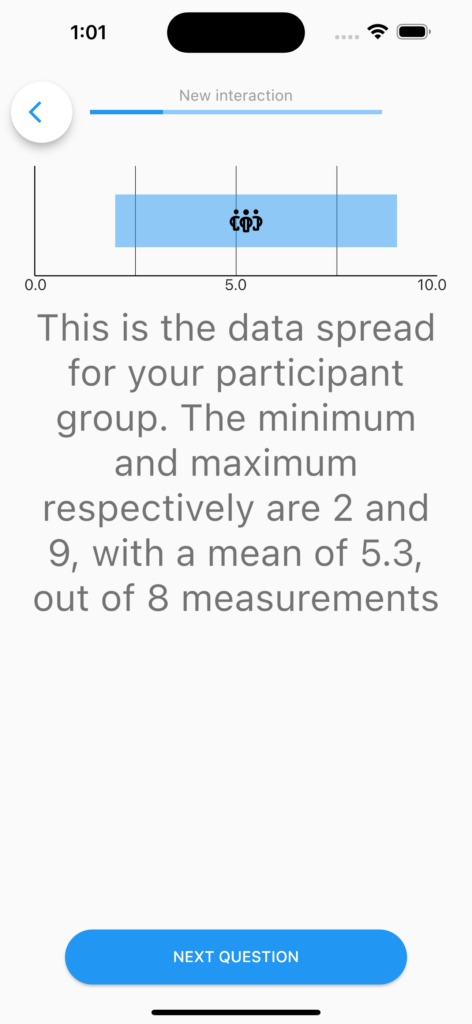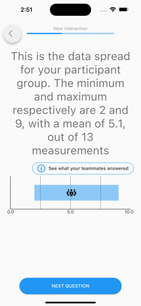 In your m-Path dashboard it is possible to divide clients in groups. This can be useful for several reasons, one of which being that data can be shared within groups. While the Group Statistics item allows you to pipe certain aggregative values to computations or question texts, the Group Summary questionnaire item shows a graphic overview of the aggregated results of a certain group for a single continuous-value question, or for an open question, and allows a user to situate themselves within that group.