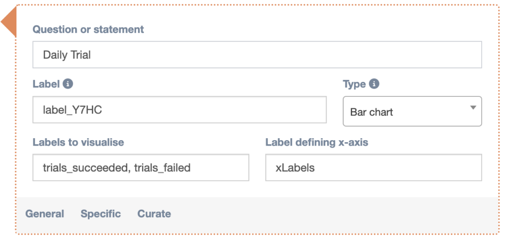 Here you can enter a comma-separated list of labels that you want to compare. These labels will most likely be the names of numeric lists you’ve assigned in a computation. These labels will be humanized in the app, so a label “this_label_counts” in the computation will be converted to “This label counts” when it gets visualised.