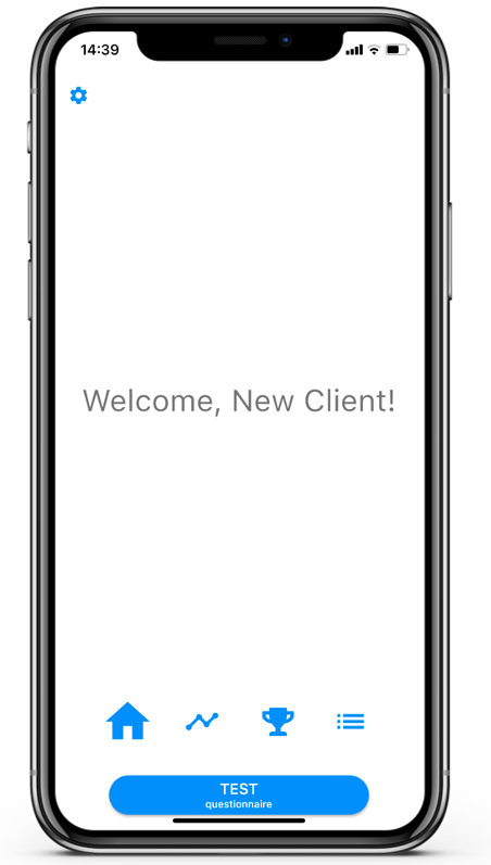 - State 1: The button reads ‘TEST questionnaire’. The client is new in the app and has not yet received or answered any questionnaires. When the client clicks on the button he or she can answer a test or play questionnaire.