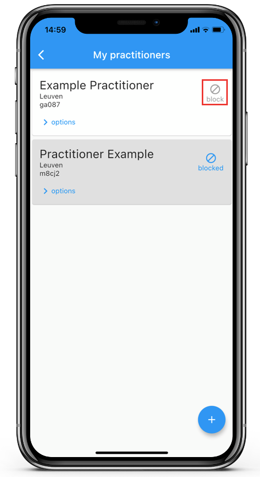 When you’ve blocked a practitioner, the practitioner’s/researcher’s box will turn grey and the Blocked icon will turn blue.