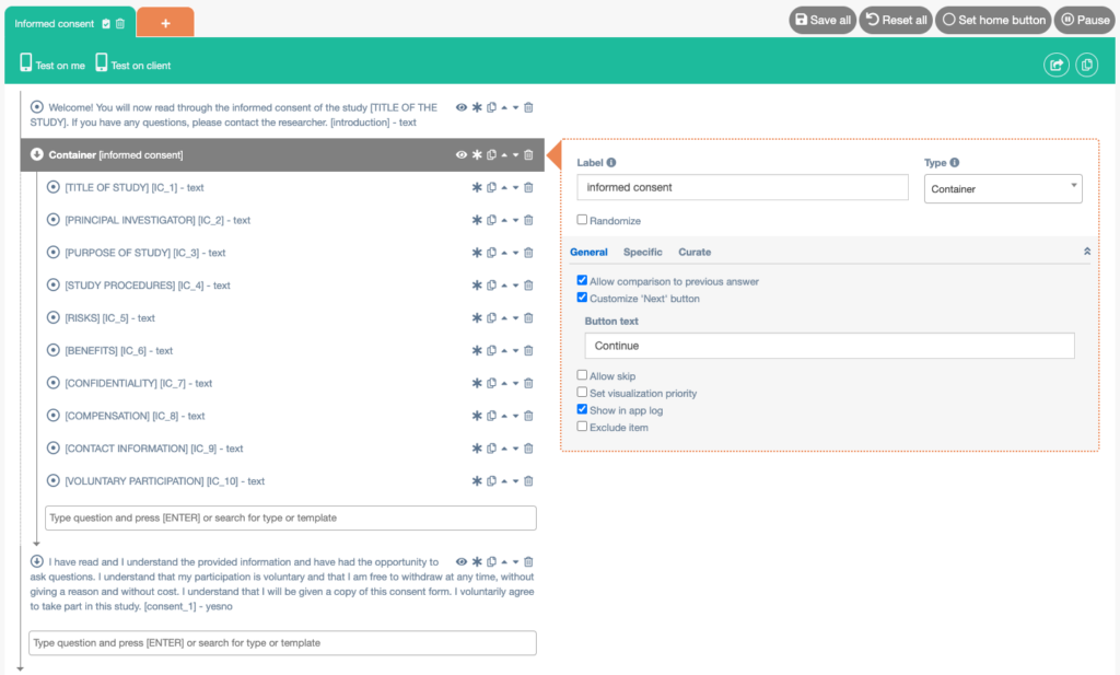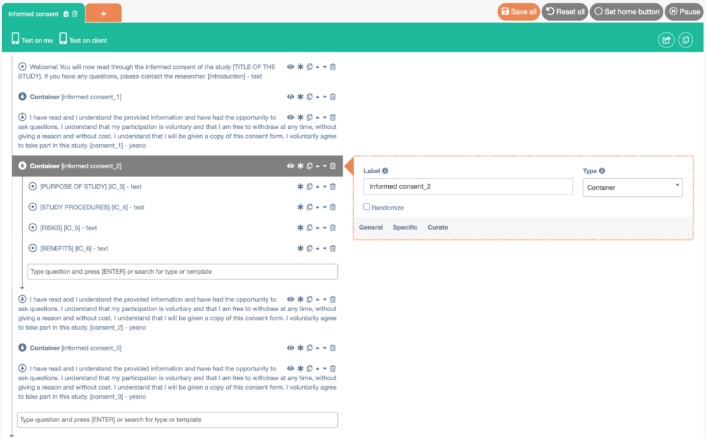- Keep repeating this (creating Containers and Yes/No questions) until all sections of your informed consent are in the questionnaire.