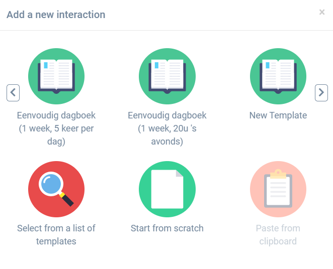 To add a protocol to a specific client, go to the Edit tab for this client and click on the ‘+’ icon. The Add a new interaction screen is now shown (see figure below). In the upper row, all available protocols are shown. You can scroll through all available protocols by clicking on the left and right arrow. Click on one of the protocols to use it for the specific client.