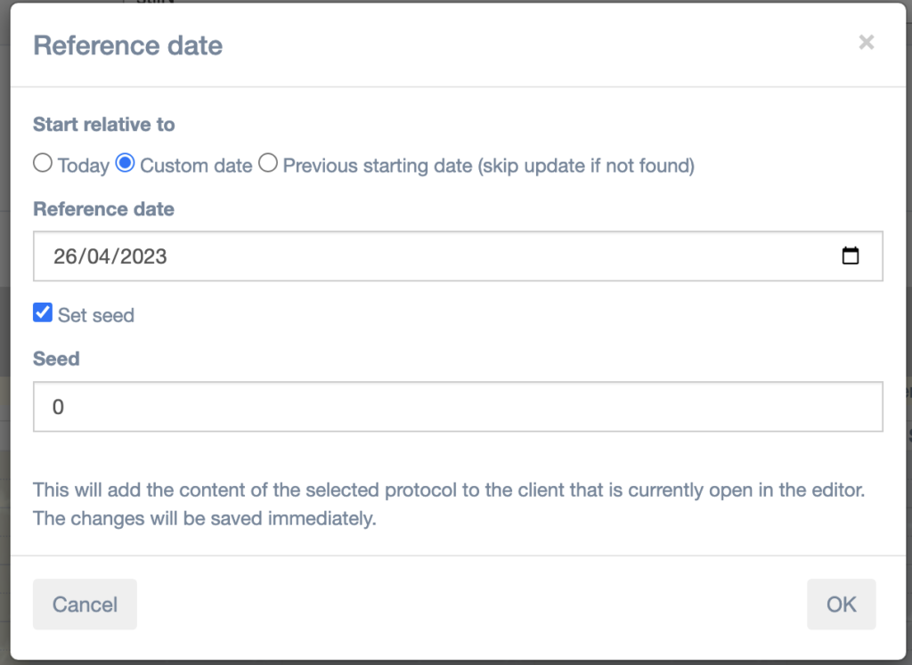 - Previous starting date: If you want to reapply the protocol for someone but use the previously used starting date, choose this.
